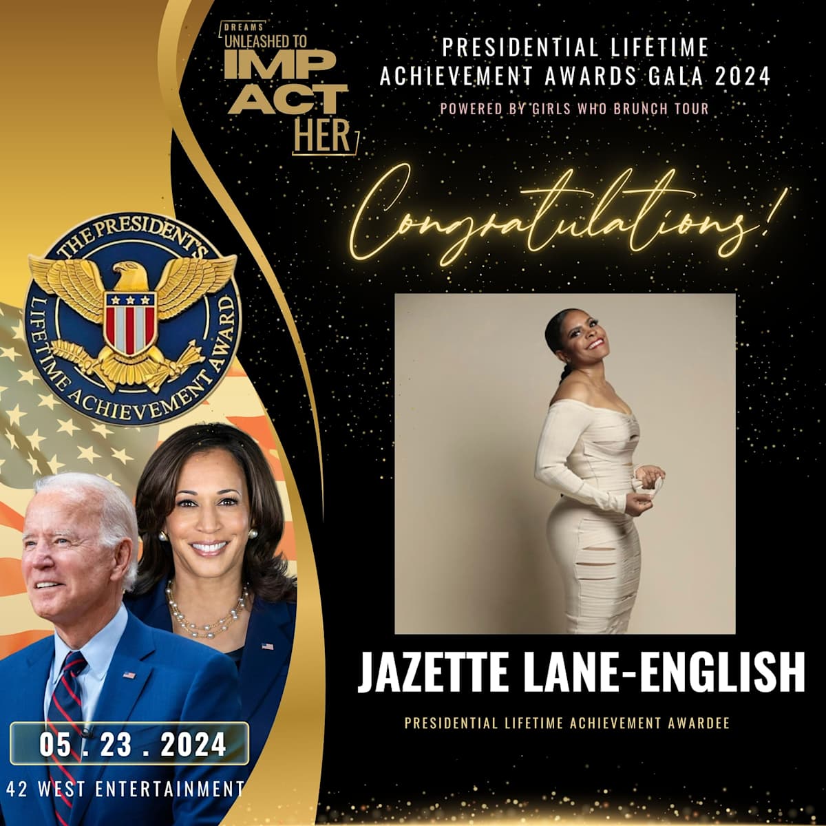 Jazette Lane-English, was utterly humbled and grateful to be among the distinguished honorees of the Dreams Unleashed Presidential Lifetime Achievement Award Event, presented by Girls Who Brunch Tour! Jazette and sports icons were recognized by The Whitehouse for making a profound impact in sports and philanthropy. This prestigious award is a testament to the power of dedication, hard work, and resilience.